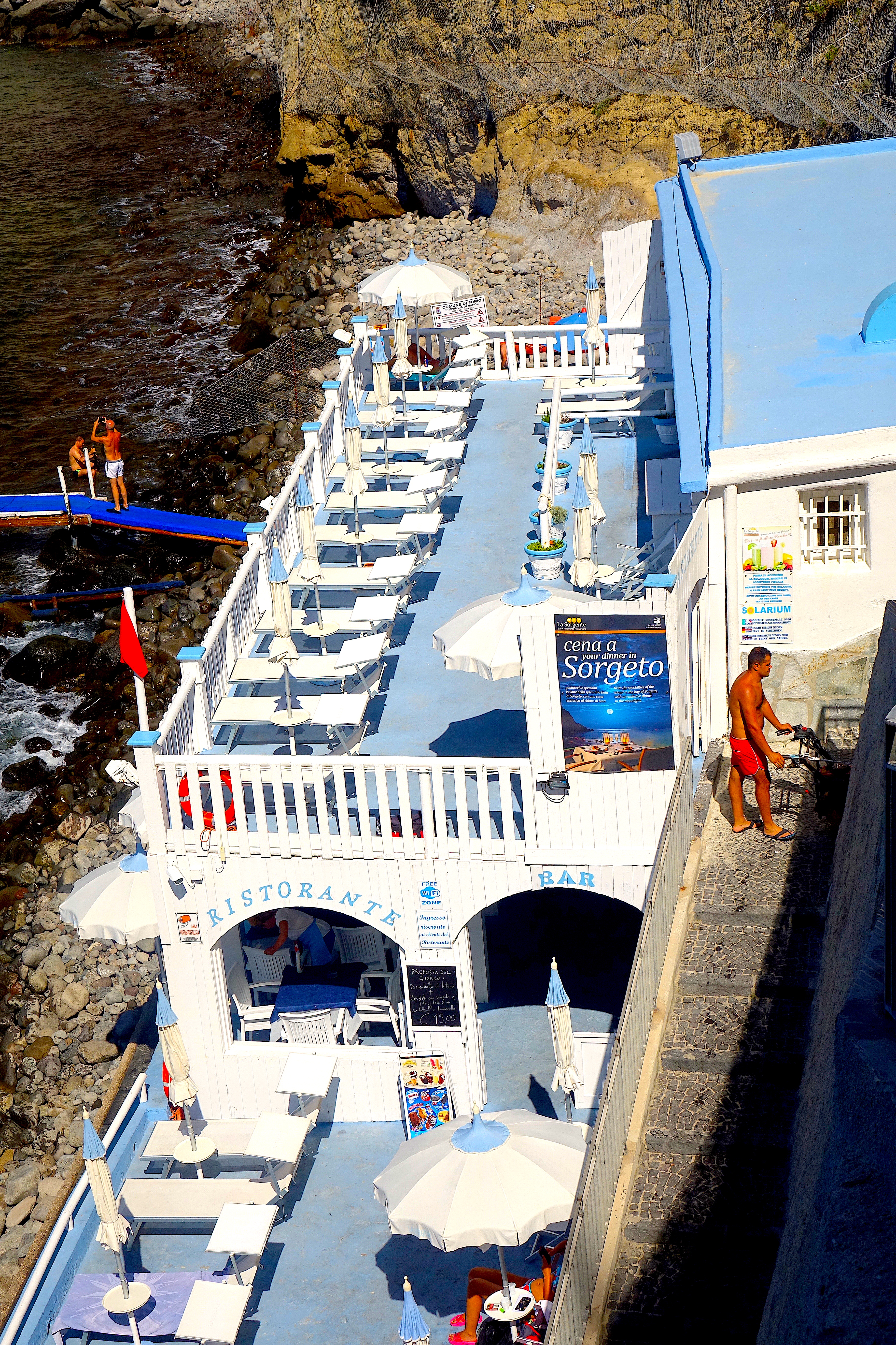 After we have spent a few hours bathing in the various rock pools and have had a good, soothing dose of the thermal mineral waters, from the coolest to the most tolerably hot, we are always more than ready for a delicious lunch. We head over to La Sorgente, the restaurant (bar and solarium) we just love —which is perched right over the rocks on the shoreline in the center of the bay.