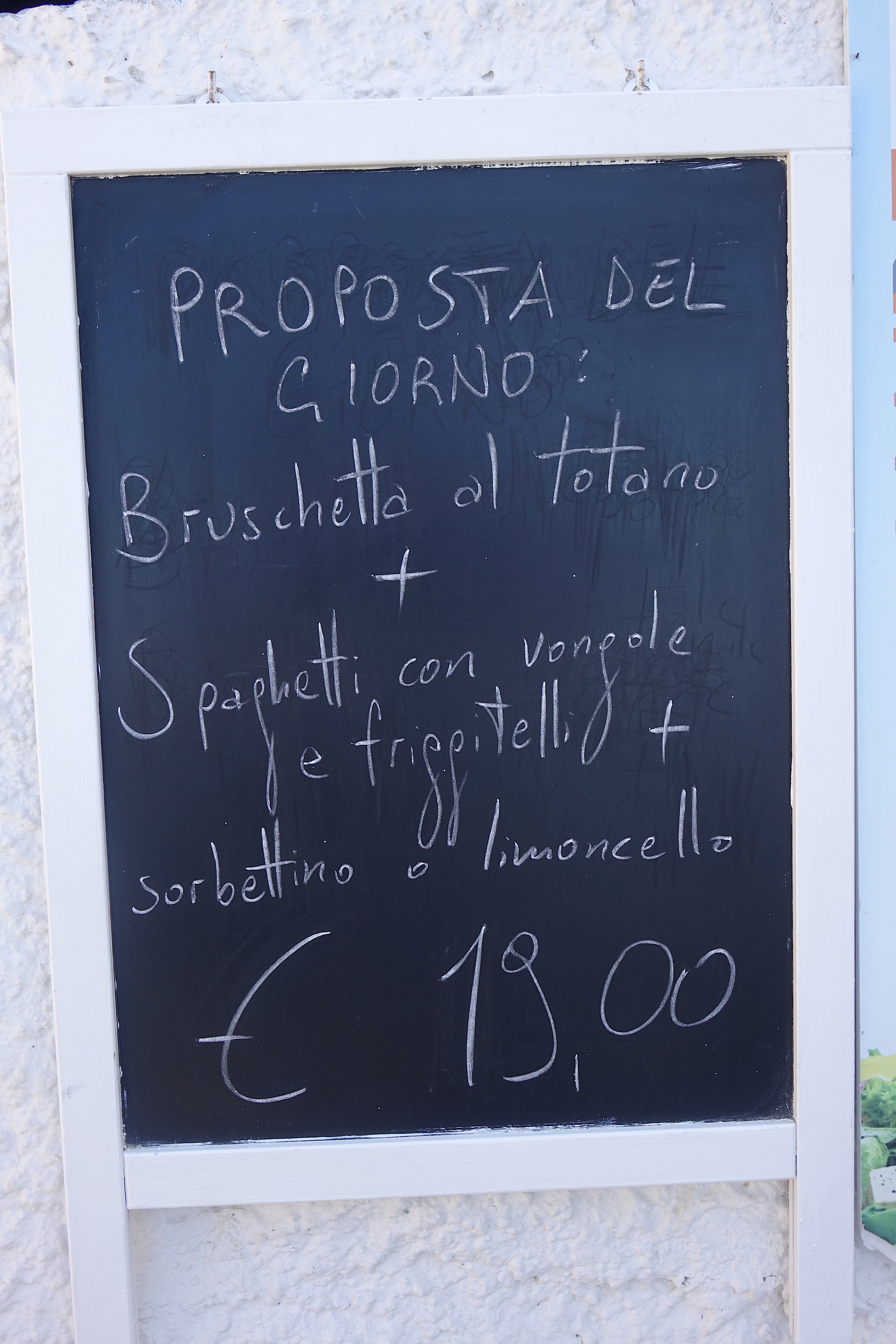La Sorgente’s menu features primarily the local specialty dishes with an emphasis on fish and seafood. For starters, try the marinated swordfish, salmon, and anchovies (antipasto misto di mare) or the octopus and cuttlefish braised in tomatoes (polipo e seppioline affogate), which are both delicious choices. They also offer a wonderful selection of bruschetta, little crusty slices of bread with a variety of savory toppings. One of my favorites is the bruschetta topped with a cold octopus and potato salad. For a first course, spaghetti with either clams, mussels, or shrimp, the simple local specialties are always the best. For a second course, I like the simple grilled assorted fresh fish and seafood (grigliata mista di pesce) or the whole fresh sea bass cooked in its own juices (spigola all’acqua pazza). You can also opt for the daily price fix menu that is composed of an antipasto, first course, and dessert, which is always a good deal and immensely satisfying.