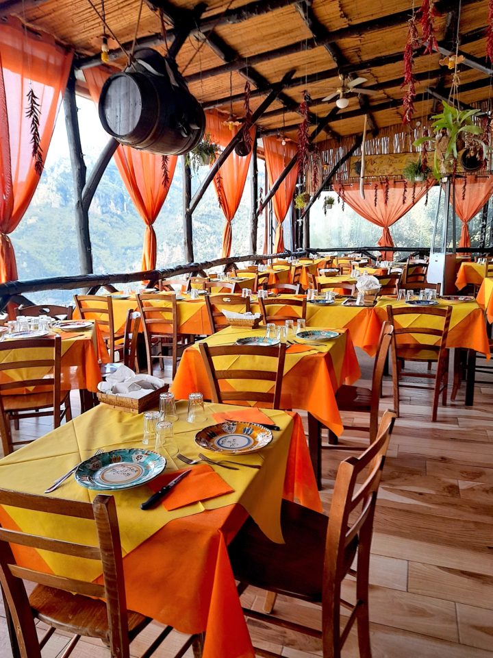Stepping into this charming place immediately offers a rustic, down-to-earth feel—from the wood beamed ceilings and furniture colorfully decorated in orange and yellow, to the old wine barrels, woven chestnut baskets and red chili peppers hanging from the exposed beams, to the festive ceramic tableware locally-made by hand in Positano. It’s got a cheerful, easy and breezy ambiance that’s hard to resist —any time of day or at night when dimly lit under the glow of the romantic moon.
