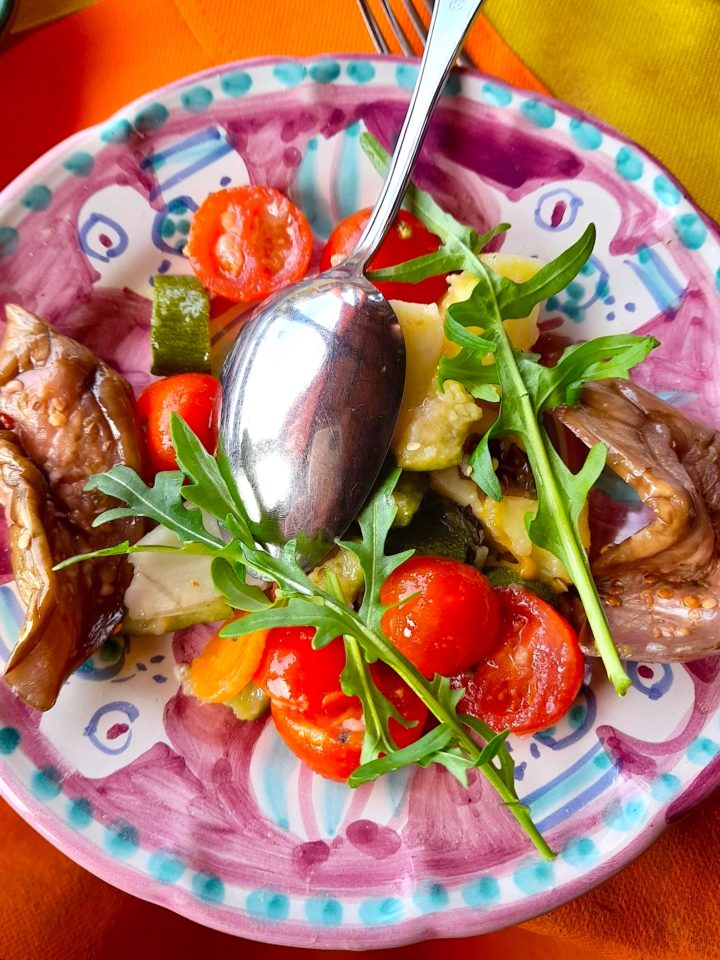 In addition to the simple refreshing salad with potatoes, cherry tomatoes, marinated eggplant slices and cubed zucchini, and rucola —and the fresh mozzarella and prosciutto salad above, here’s a look at a few of the delicious antipasti (appetizers) that circled our table at a recent lunch.
