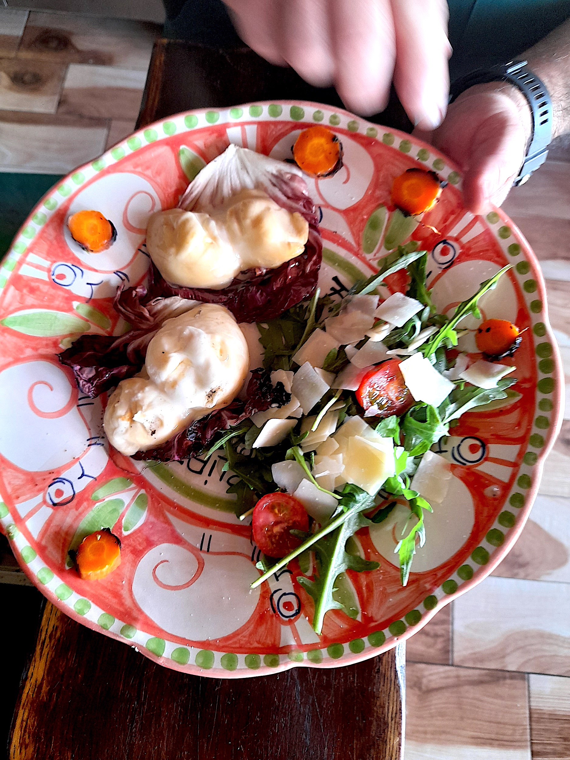 Fattoria La Tagliata’s second course is all about the grill. They offer a delectable selection of fine-quality, free-range meats to choose from. And, for vegetarians, the grill master, Claudio, grills up a locally-made cheese filled with green olives, called diavoletti, over radicchio leaves —and serves them, hot and oozy, right off the grill, with a mix of grilled vegetables and crusty slices of rustic bread.