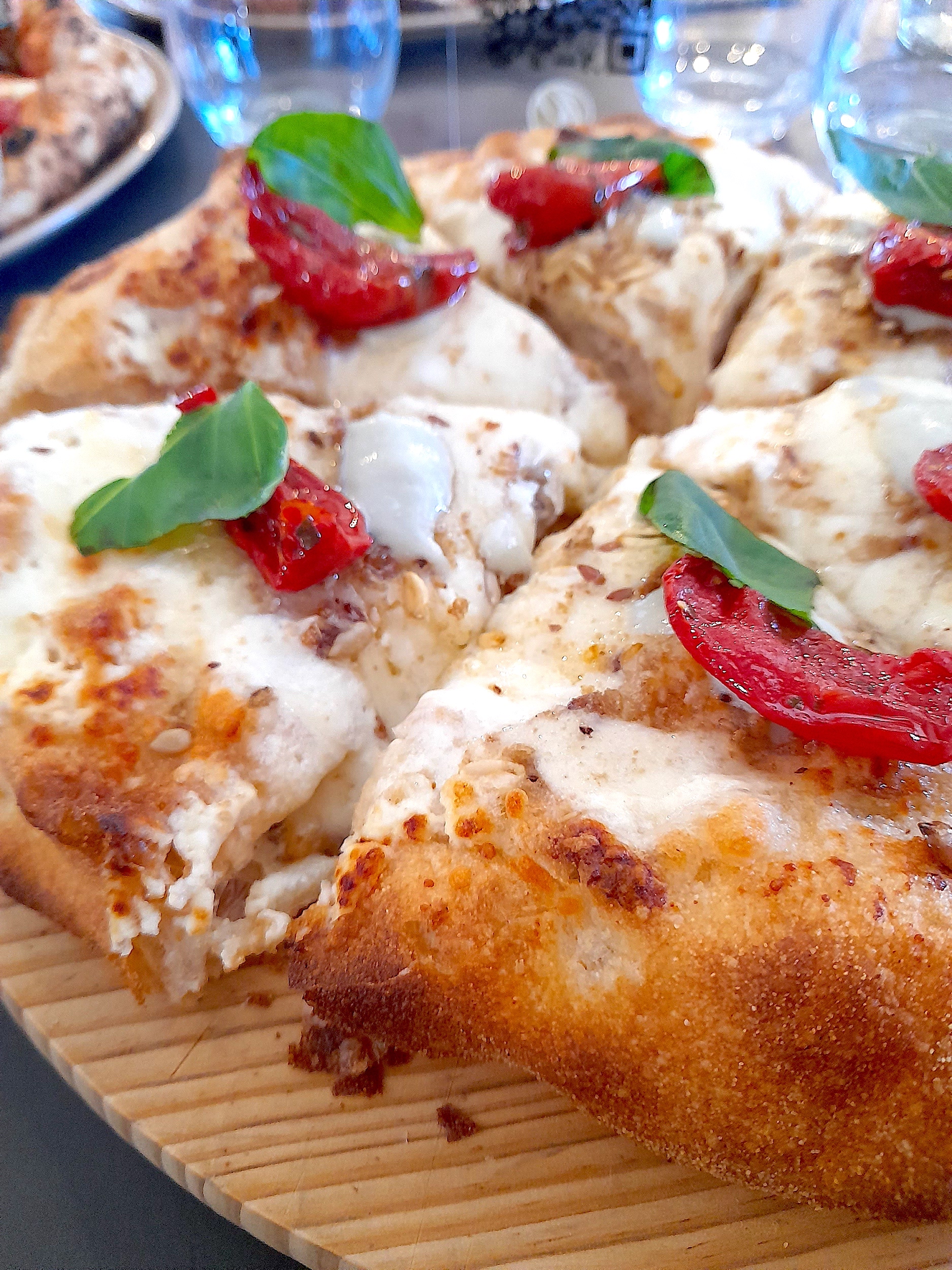 One of Diego’s exciting, relatively new creations, which came to be back in 2021, and a source of pride for him, is the “pizze croccanti.” The slowly leavened, highly hydrated pizza is baked in two different ovens and temperatures, creating an almost focaccia like pizza, with an intense, intoxicating fragrance. Here’s the “4 casi Campani” topped with Provolone del Monaco, caciocavallo Podalico, Blu di bufala, Pecorino Carmasciano, mozzarella from Agerola, semi-dried tomatoes, a sprinkle of multi-grain cereal, curley basil, and extra-virgin olive oil.