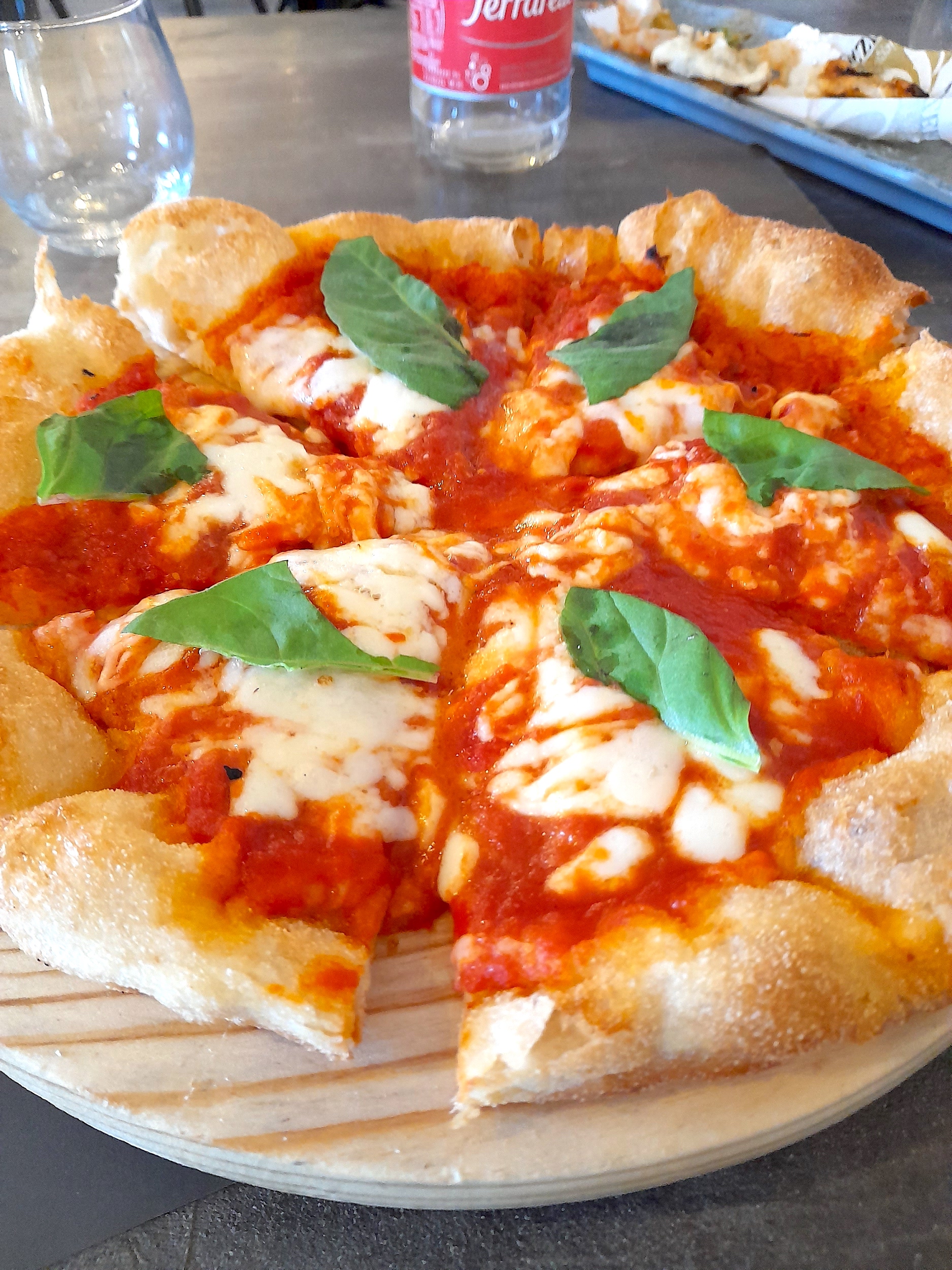 The classic “Pizza Margherita” with San Marzano DOP tomatoes, mozzarella from Agerola, Grana Padano, Neapolitan basil, and intensely fruity extra-virgin olive oil
