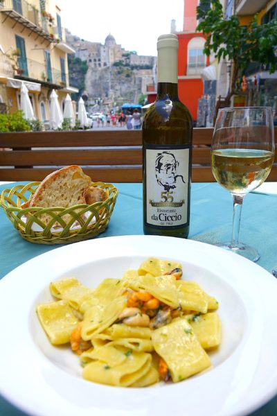 Just a few steps from the Sorgeto hot springs, one of Ischia’s natural wonders, is this wonderful restaurant, set atop the rocks just above the shoreline. From here you can admire the spectacular natural setting while dining on superb fish and seafood dishes —like spaghetti with clams and large tube pasta with flying squid and tomato. Ask to see the tray of the daily catch. For a second course, try the whole fish, either grilled or all’acqua pazza (cooked in its own delicious broth). There’s also a great selection of bruschetta (crusty slices of rustic bread) with savory topping’s, like a refreshing, cold octopus and potato salad, which is a favorite of mine. Open daily for lunch and dinner. Via Sorceto, 80075 Forio d’Ischia (Panza), NA, tel: 39 081 907837 – (explore more) –$$-$$$
