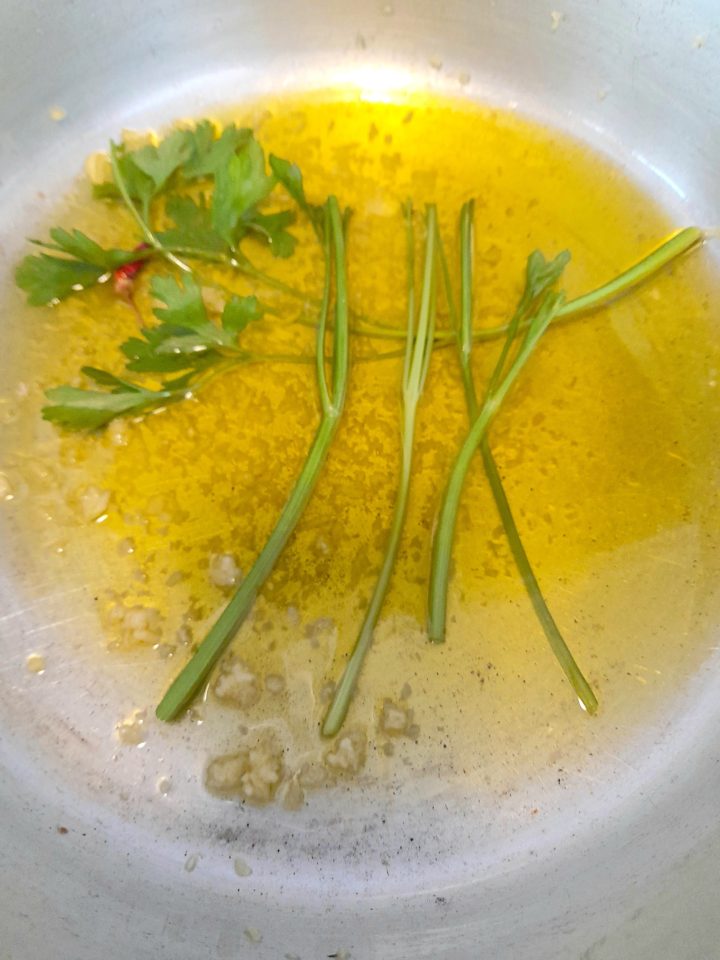 - In a medium pan, put the olive oil, garlic, hot chili pepper, and whole stem of parsley and stir over medium heat, about 45 seconds to one minute, stirring frequently. If you like, you can drop the remaining stems in the pan to add an additional touch of fresh green taste to the olive oil.