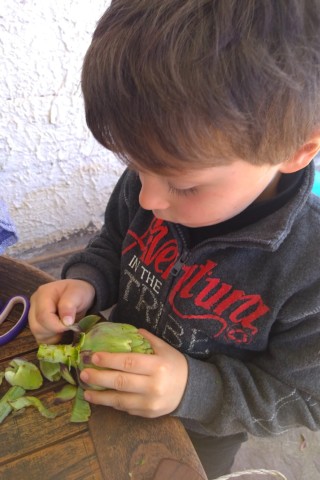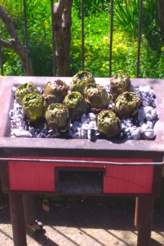 Roasting directly on the radiant heat of the embers gives a lovely aromatic quality to the artichokes as a result of the smoking and burning effects. But to achieve “ottimo” (the greatest) results, a tender core inside the charred surface with an intense smokey, aromatic taste, the temperature of the embers are important when you begin the cooking. If the embers are too hot the surface of the artichokes will blacken quickly and not leave enough time for the inner core to soften. The simple, yet crucial rule of thumb is to just light the coals, and when no more black smoke is emitted and the embers have turned grey/white, they are ready – the perfect temperature.