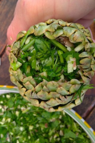 - Spread apart the leaves of the artichoke so you can reach the center, then stuff it with about 2 tablespoons of the filling. Drizzle into the center over the top of the filling a little additional olive oil. Squeeze the artichokes closed to obtain their original form. Set aside in a bowl standing upright while you prepare the remaining artichokes.