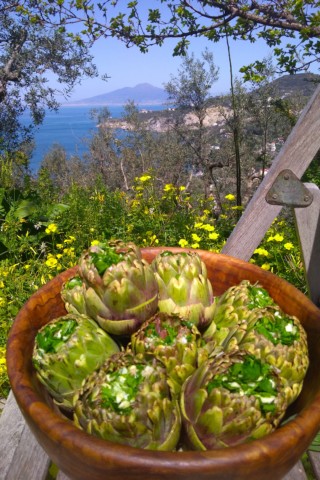 Campanian’s typically seek out the “Carciofi Violetti di Schito” (Schito artichokes) from Castellammare di Sabia, a province of Naples, for this, which make their grand appearance at the local farm stands from February through mid May. Otherwise, they use Roman artichokes, which are similar; a greenish-purple globe variety that is compact, free of thorns, tender, meaty, and delicate tasting with barely no choke at all.