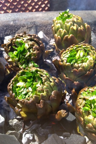 Even though the artichokes are filled with just a few ingredients for this preparation; garlic, parsley, salt, pepper, and extra-virgin olive oil or lard (rendered pork fat), and then roasted in a manner as simple as can be – directly over the radiant embers of an open fire – don’t think by any means they lack in flavor or depth. They are delicious and immensely satisfying; an absolute sure-bet welcomed addition to any springtime barbecue in every sense of the rustic way.