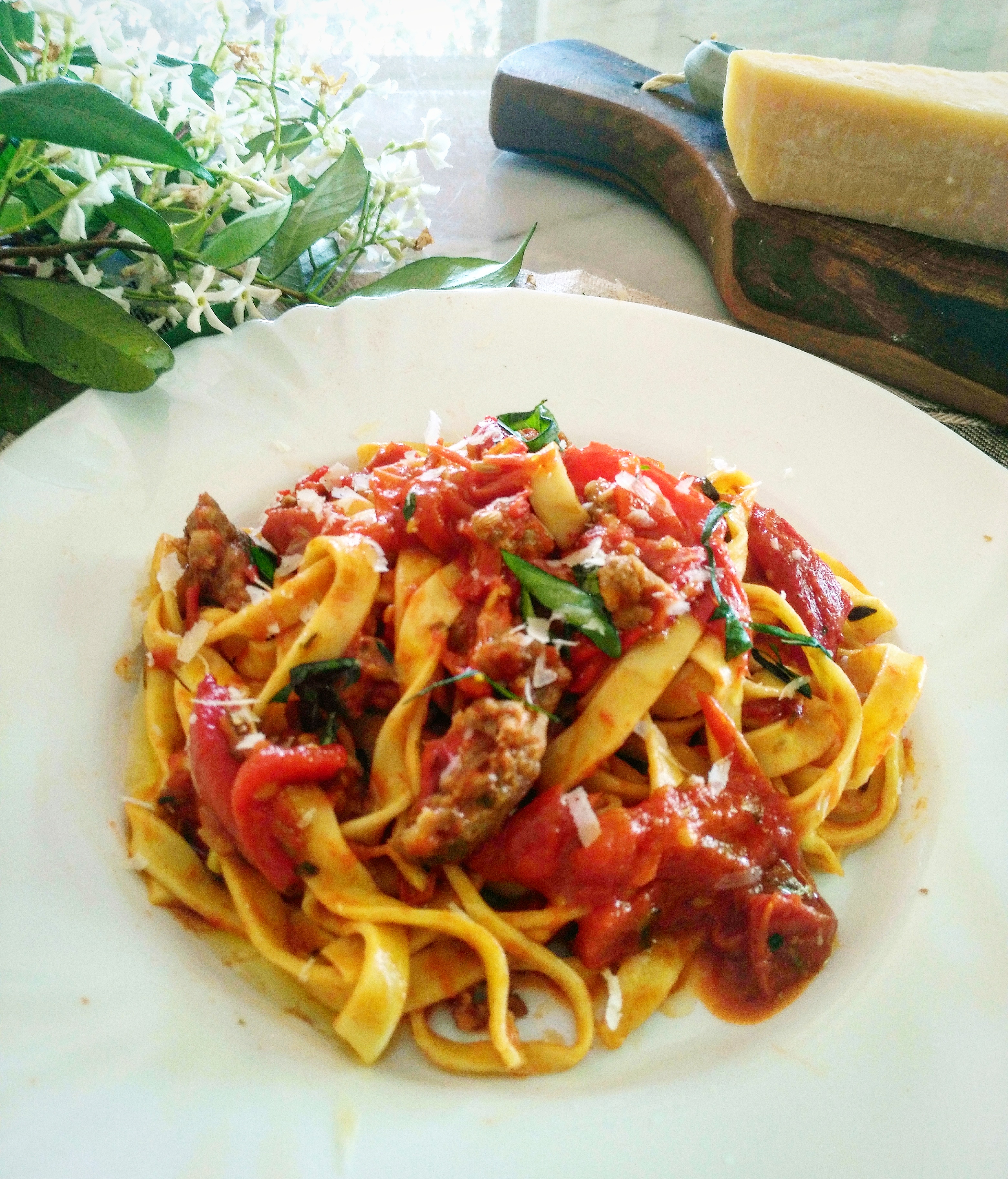 Fresh Egg Pasta with Sweet Italian Sausage, Roasted Red Bell Peppers, and Cherry Tomatoes