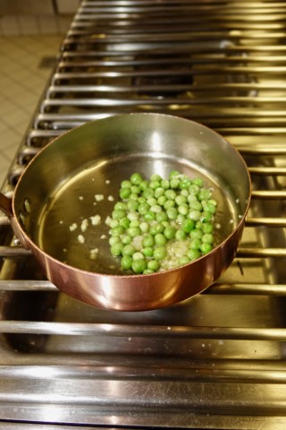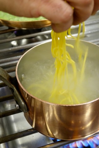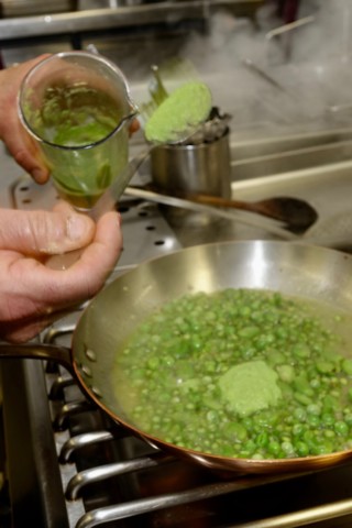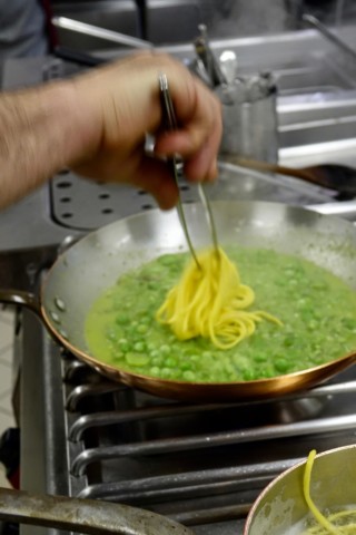 To make the sauce, Antonio first combines a small portion of the sweet peas, onions, and olive oil in a small pan and gently sautés until the vegetables have softened. Then he purées the mixture with a hand blender until smooth and creamy and sets it aside. Afterwards, he combines the broad beans, asparagus, remaining sweet peas, onions, and olive oil in a large pan (and a ladle or so of the pasta cooking water) and gently sautés until the vegetables have softened, but still have a bite, and the broth like sauce has reduced. Towards the end of the cooking, Antonio then stirs the purée into the sauce, giving it an elegant, creamy texture that mingles with the fresh egg pasta scrumptiously – making each forkful, one to remember.