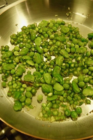 - In a large saucepan over medium-low heat, combine the remaining onions and 3 tablespoons of olive oil and sauté for about 1 minute, stirring occasionally. Add the broad beans, asparagus, remaining peas and a pinch of salt and toss to combine. Pour in just enough water to cover the vegetables and bring the liquids to a gentle simmer over moderate heat. Cook for about 15 to 20 minutes or until the vegetables have softened but still have a bite, adding a little pasta cooking water from time to time as needed to finish up the cooking. Towards the end of the cooking time, stir the vegetable purée into the sauce and stir well to combine.
