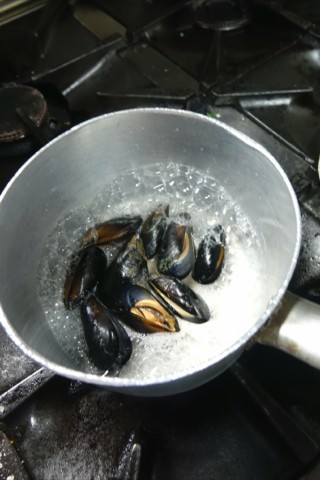 - Heat a large sauté pan over medium-high heat, add the mussels and a small ladleful of water and cover the pan. Sauté until the shells open, about 2 to 4 minutes, shaking the pan occasionally. Remove the pan from the heat.