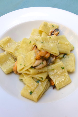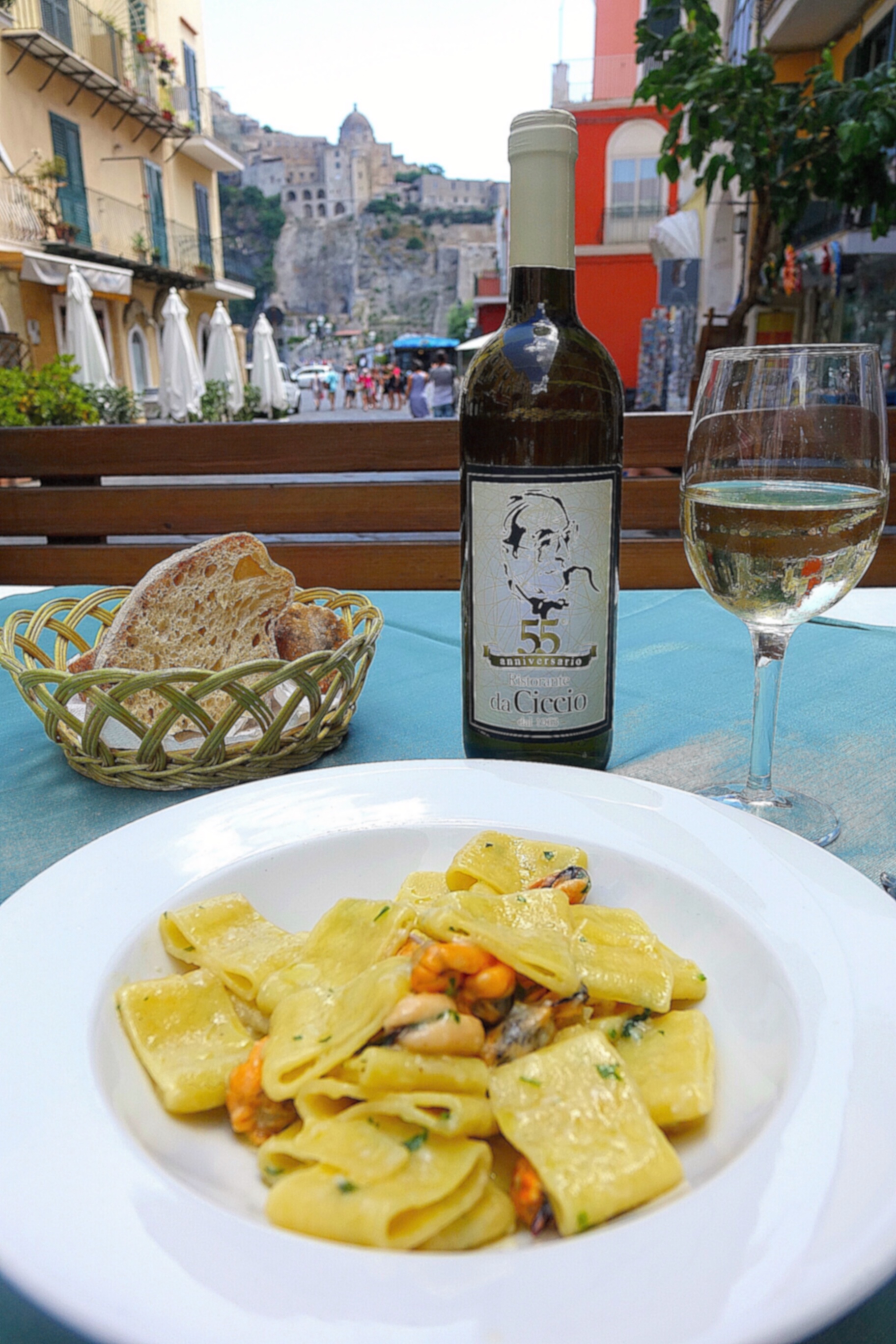 Calamarata con Cozze e Pecorino (Pasta with Mussels and Pecorino), a beloved classic Ischitani pasta dish, is one of the many local specialty dishes Chef Guido Buono so brilliantly cooks up that continues to lure me back to the table time and time again.