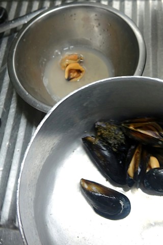 - Using a fine-mesh sieve, strain the mussels over a bowl to get rid of any sand and grit, reserving the juices. Discard the unopened shells. Remove the meat from the remaining shells and place in the bowl with the juices.