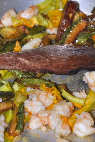 - Meanwhile, in a large skillet over moderate heat, combine the olive oil and garlic and stir until barely fragrant, about 15 to 20 seconds. Add the shrimp and stir for 30 seconds. Add the zucchini and one-half of the blossoms and stir briefly, about 30 seconds longer. Season with salt and a generous pinch of pepper. Pour in 1 cup of the pasta cooking water and the cream and stir to combine thoroughly.