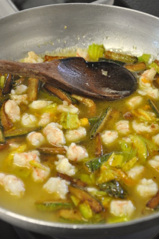 In summer, when zucchini thrives in the mineral rich lands all over the Campania region, their bright, colorful blossoms make a sunny appearance in many of the local specialty dishes. This tasty pasta dish, which combines the blossoms with sweet, succulent shrimp and fried zucchini sticks, I learned to make one fortuitous summer morning when I decided to visit my friends Luigi and Rosa Guarrancino at their charming restaurant, called Il Fienile, located near my home in the village of Torca in Massa Lubrense.