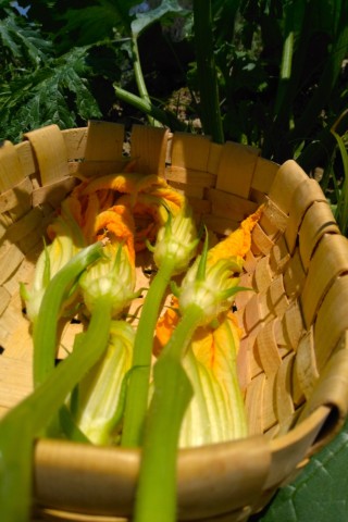*Pick the crisp zucchini blossoms in your home garden right before you begin to cook or search for freshly picked blossoms at your local farm stand and use them soon after purchase when they are still the color of sunshine and have crisp petals and moist green stems. Keep the blossoms in a sealed plastic bag in the refrigerator until you are ready to begin the cooking to prevent them from wilting.